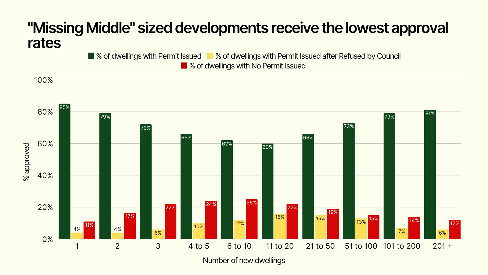 - "Missing Middle" projects (6 to 50 dwellings) have the lowest approval rates at just above 60% of dwellings being approved by Council.